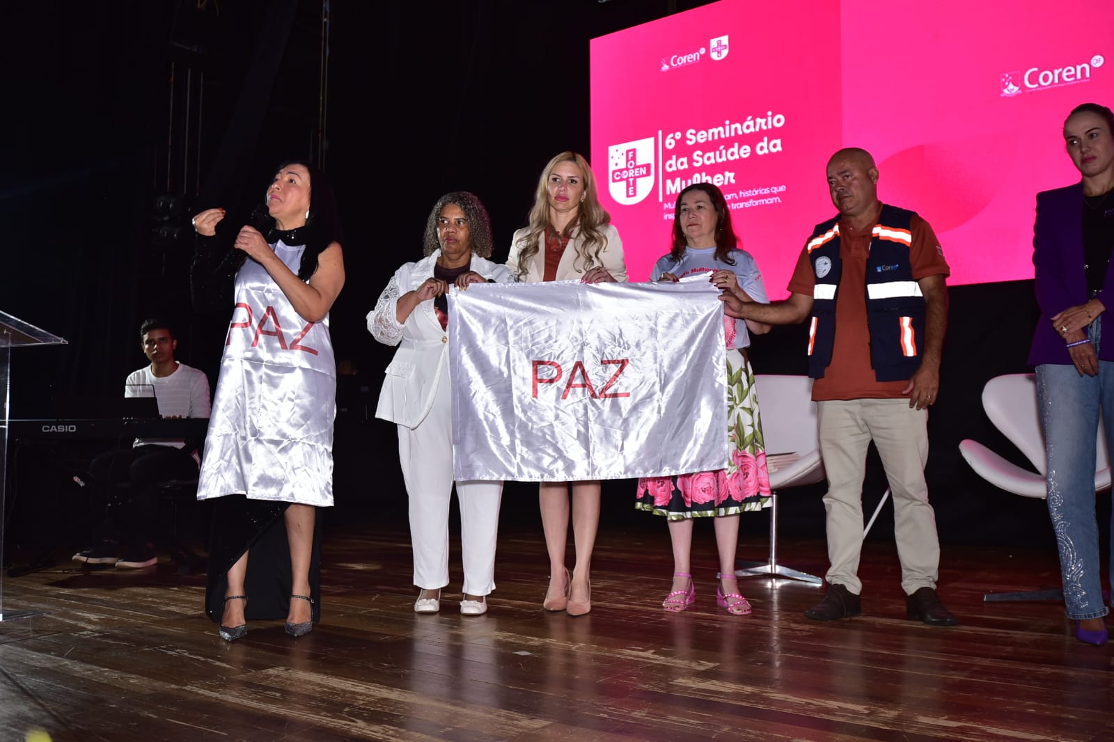 A mesa de abertura contou com a presença da tesoureira Valda Fumeiro, do presidente do Coren-DF, Elissandro Noronha, da representante do Conselho Federal de Enfermagem (Cofen), Tatiana Melo, do coordenador da Comissão Nacional de Saúde da Mulher do Cofen, Reneé Costa e da Subsecretária de Promoção das Mulheres, Renata D’Aguiar.