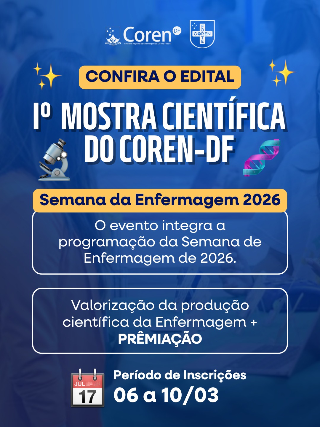 O Conselho Regional de Enfermagem do Distrito Federal (Coren-DF) abriu as inscrições para a I Mostra Científica do Coren-DF, que integra a programação oficial da Semana da Enfermagem 2026 e será realizada nos dias 7 e 8 de maio, no Centro de Convenções Ulysses Guimarães. A iniciativa o objetivo de valorizar, divulgar e reconhecer a produção técnico-científica da Enfermagem.