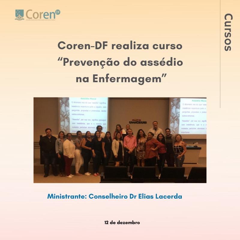 O Conselho Regional de Enfermagem do Distrito Federal (Coren-DF), realizou ontem (12), o curso “Prevenção do assédio na Enfermagem: Assédio Moral no Ambiente de Trabalho e Mediação de Conflitos na área de Enfermagem – Avanços, Desafios e Perspectivas”. O evento que aconteceu no auditório do UniCEUB (Taguatinga), foi ministrado pelos Conselheiros Dr. Elias Pereira De Lacerda e José Lino de Queiroz.