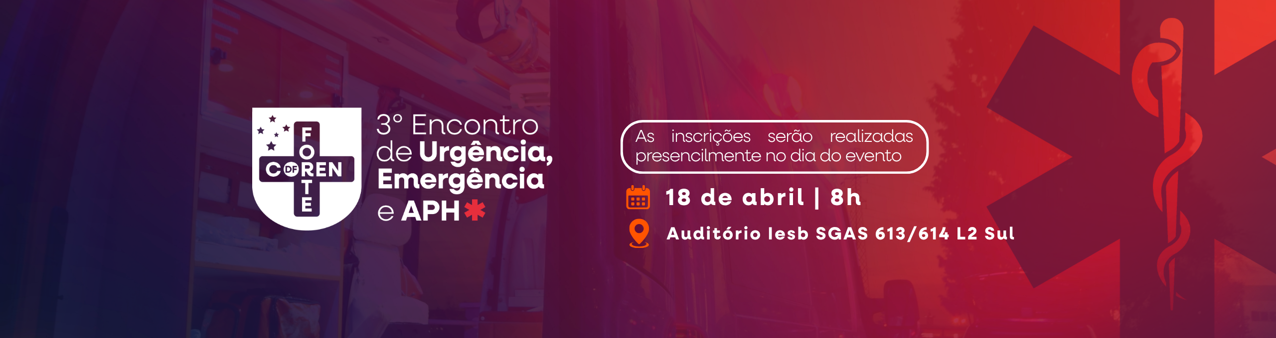 No dia 18 abril, o auditório do Iesb sediará o 3º Encontro de Urgência e Emergência. As inscrições serão realizadas presencialmente no dia do evento.