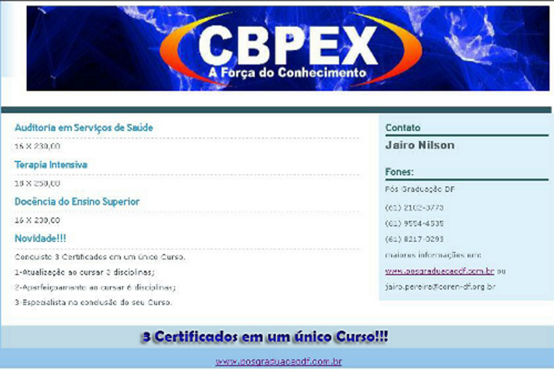 No momento através desta parceria, a CBPEX está oferecendo em Brasília Cursos de Especialização na área de Enfermagem, os cursos são oferecidos no Auditório do Coren – DF, localizado no endereço: SDS – Edifício Eldorado – Loja 35 – 1º Subsolo – Asa Sul (na Sede do Coren – DF do Conic).