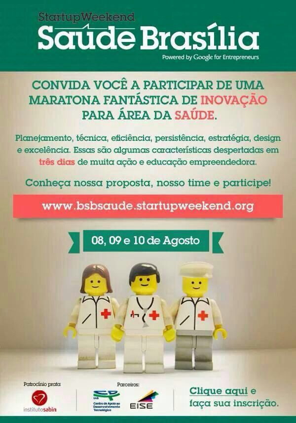 A primeira edição do Startup Weekend Saúde acontece em Brasília entre 8 e 10 de agosto. O evento dura 54 horas, ao longo de um fim de semana, e reúne empreendedores, desenvolvedores, designers e entusiastas para compartilhar idéias, formar equipes e criar protótipos de empresas. O objetivo do encontro é promover e resgatar o propósito de servir que envolve os profissionais da área da saúde, reunindo-os com empreendedores para a geração de soluções centradas no ser humano.