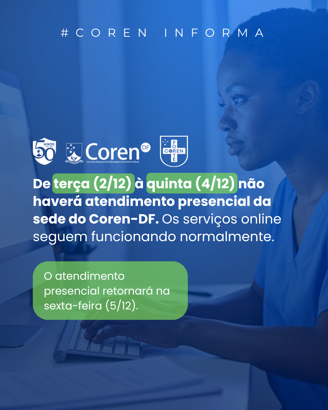 Não haverá atendimento presencial da sede do Coren-DF de 2 a 4/12. Serviços online segue funcionando normalmente