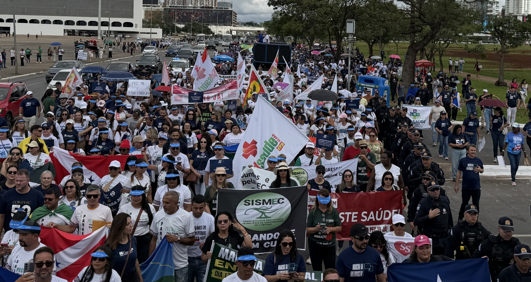 Contrariando previsões da chuva, o tempo abriu para a Marcha pela Valorização da Enfermagem atravessar a Esplanada dos Ministérios até o Congresso Nacional. Representando 3 milhões de profissionais, 5 mil participantes de todo Brasil pedem o reajuste do Piso Salarial e a aprovação da Proposta de Emenda à Constituição (PEC) 19. A PEC 19 prevê correção inflacionária e sua vinculação do piso à jornada de 30h.