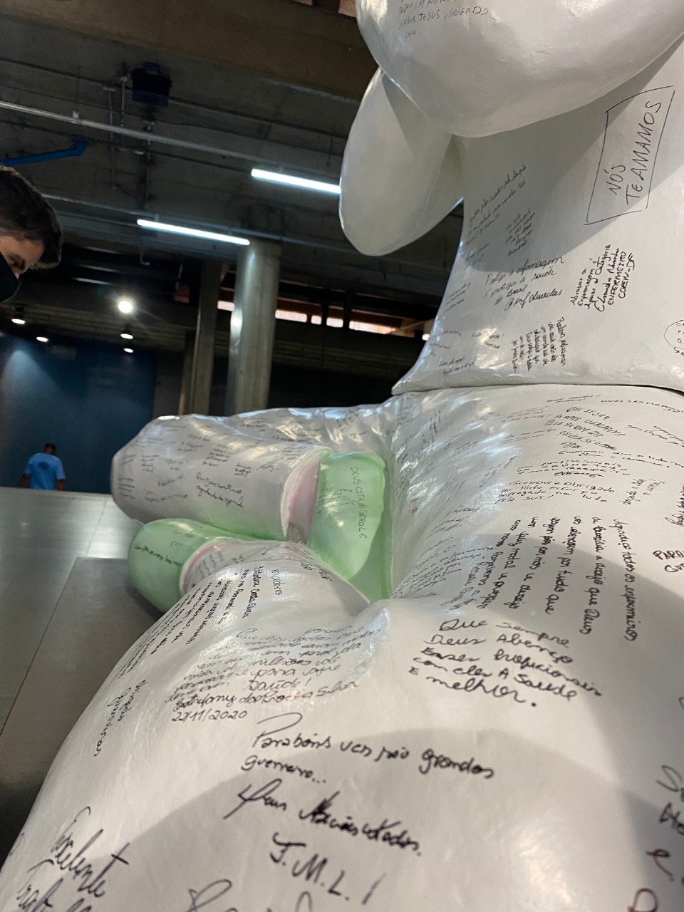 As pessoas que passam pelo Estação Central podem assinar a enfermeira gigante para demonstrar apoio aos profissionais da Enfermagem. Foi o que fez a auxiliar de serviços gerais Nilvete da Conceição Batista, de 53 anos, que ficou impressionada com o tamanho da boneca. A instalação tem 2,1 metros de altura. “Esse pessoal é muito importante. Nunca vou esquecer do cuidado e do carinho que tiveram com a minha mãe, quando ela precisou fazer uma cirurgia na barriga. Tem que apoiar eles, né? Não dá para largar eles abandonados no hospital, não”, disse a moradora de Samambaia.